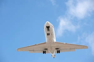 private jet on landing approach against a blue sky